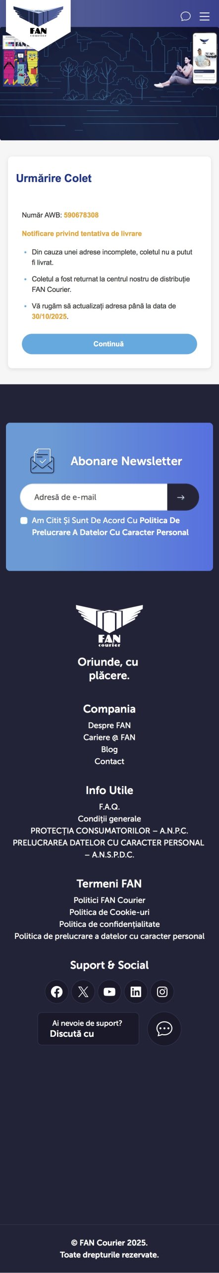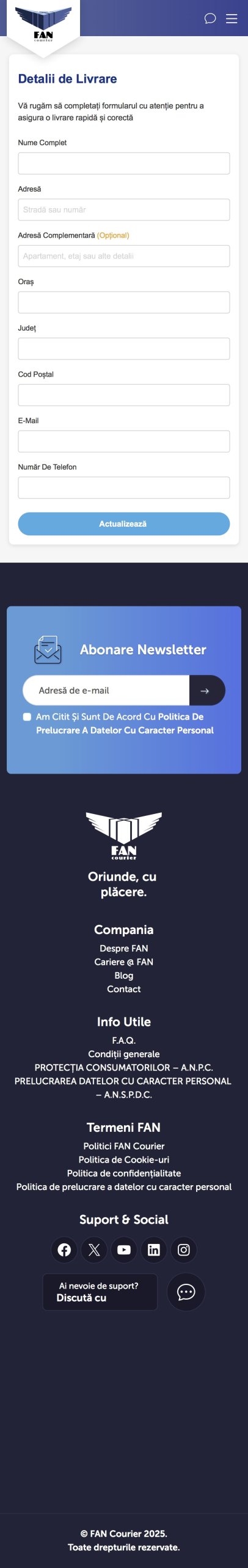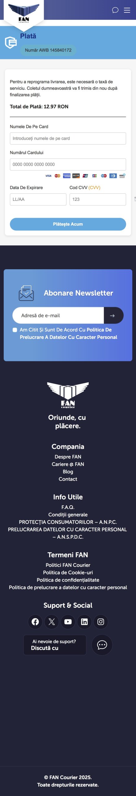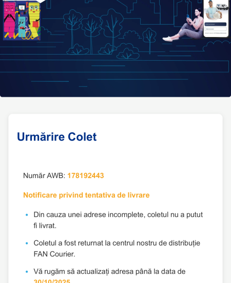FAN Courier a confirmat în mai multe rânduri că nu trimite SMS-uri care cer plata unor taxe suplimentare sau actualizarea datelor personale. Comunicarea oficială se face doar prin: