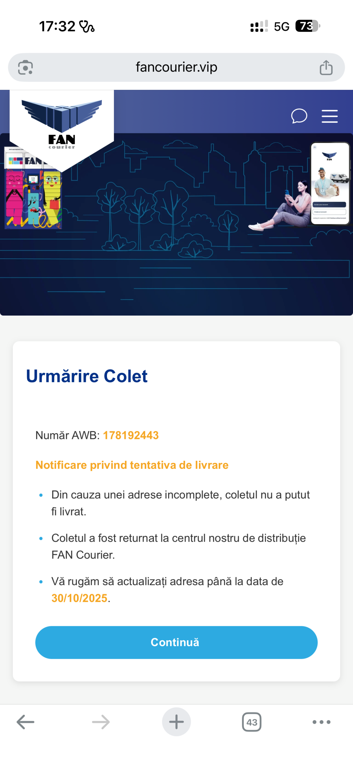 Analizând mesajele primite de mai mulți utilizatori, s-a constatat că domeniul menționat – fancourier.vip – nu aparține companiei FAN Courier. Domeniul real al firmei este fancourier.ro.