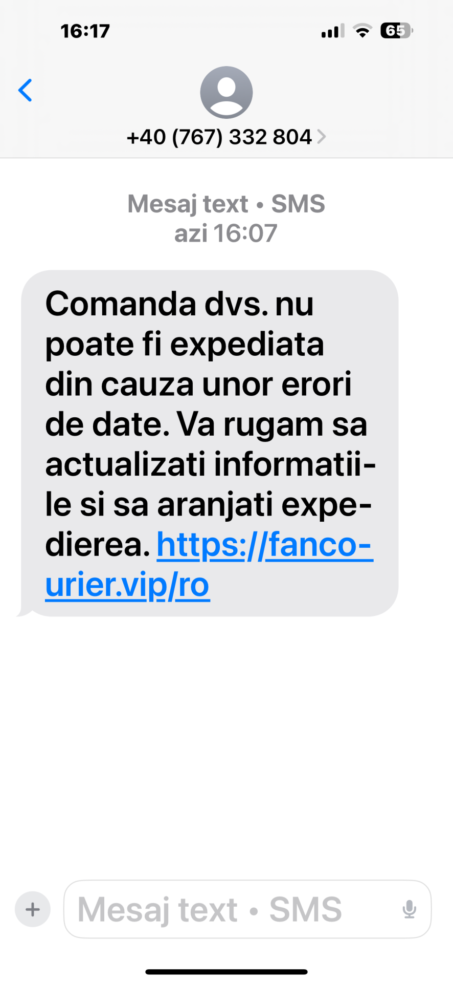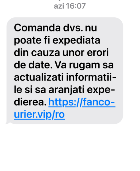„Comanda dvs. nu poate fi expediată din cauza unor erori de date. Vă rugăm să actualizați informațiile și să aranjați expedierea. hxxps[:]//fancourier[.]vip/ro” (rupem formatul linkului ca sa nu dați click din greșeală pe el).