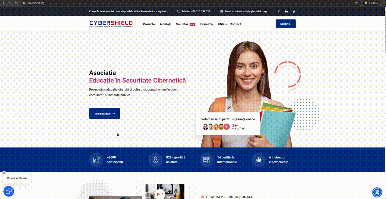 Vizitatorii pot interacționa deja cu asistentul virtual pe cybershield.org și cyberskill.ro, în colțul stânga jos al paginii. Interfața este simplă și prietenoasă, iar conversația se desfășoară în limba română. Utilizatorul poate pune întrebări libere, iar chatbotul răspunde în câteva secunde, oferind linkuri și explicații utile.